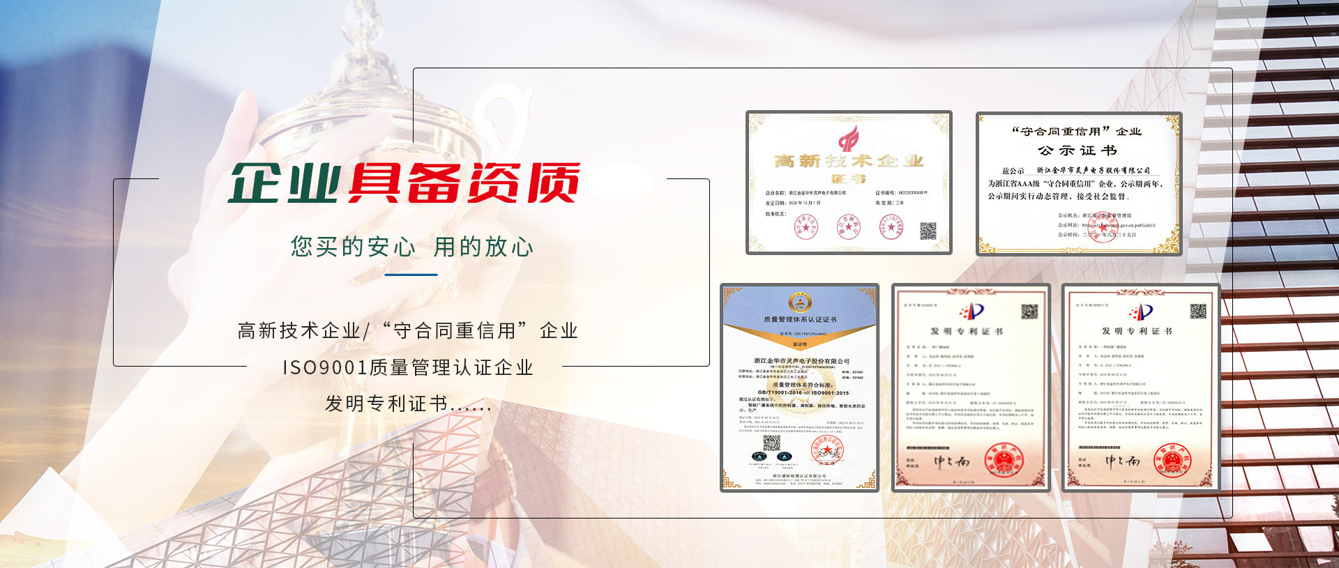 公司2001年通過ISO9001:2008國際質(zhì)量管理體系認證、ISO14001:2004環(huán)境管理體系認證,相關產(chǎn)品通過國家CCC認證及CQC產(chǎn)品質(zhì)量認證,并通過國家廣播電影電視新聞出版總局廣播電視設備器材入網(wǎng)認可。公司注重產(chǎn)品的質(zhì)量與技術創(chuàng)新,現(xiàn)建有多條先進的總裝、檢測流水生產(chǎn)線及各項檢測設備所需的儀器設備。還擁有全電磁屏蔽室一個,所有高頻產(chǎn)品的調(diào)試均在屏蔽室中進行。公司組建了高素質(zhì)的管理隊伍,設有研發(fā)部、生產(chǎn)部、銷售部、采購部、質(zhì)檢部、售后服務中心及財務部等部分,并與國內(nèi)多家大專院校、科研單位建立長期合作關系,成立了近乎是技術研發(fā)中心,是金華市職業(yè)技術學院重點示范實習基地。公司產(chǎn)品先后被浙江、江蘇、重慶、四川、甘肅、山東、湖南、湖北、貴州等文廣新局、電視臺、氣象局普遍采用,覆蓋全國各省市800多家縣(市)文廣新局、廣播電視臺,并廣泛采用于教育行業(yè),尤其是在近年來的農(nóng)村應急廣播“村村響”工程中,靈聲公司中標承建的“村村響”工程贏得了各省市廣播電視劇領導、專家們的一致好評!